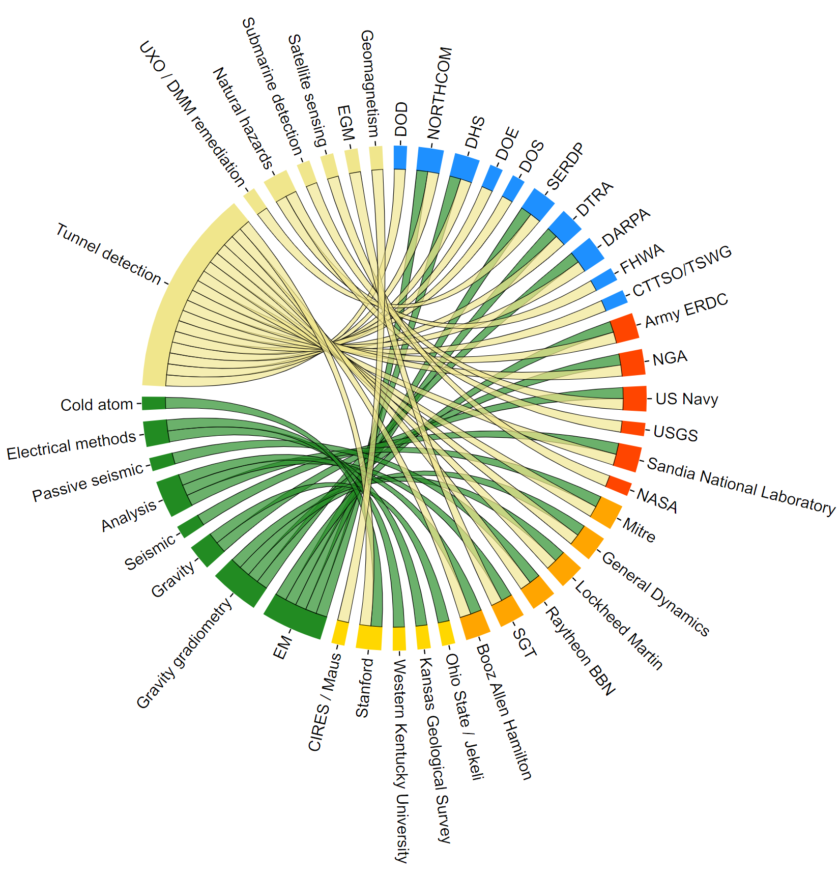 In the context of National Security, the geophysical science space is a cluttered array of federal sponsoring agencies, groups working on solutions, and various and disparate technologies. This chord chart depicts the types of interconnections between federal agencies, research groups (federal, private, and academic), technologies, and mission areas within the geophysical science space. It is by no means an exhaustive illustration.