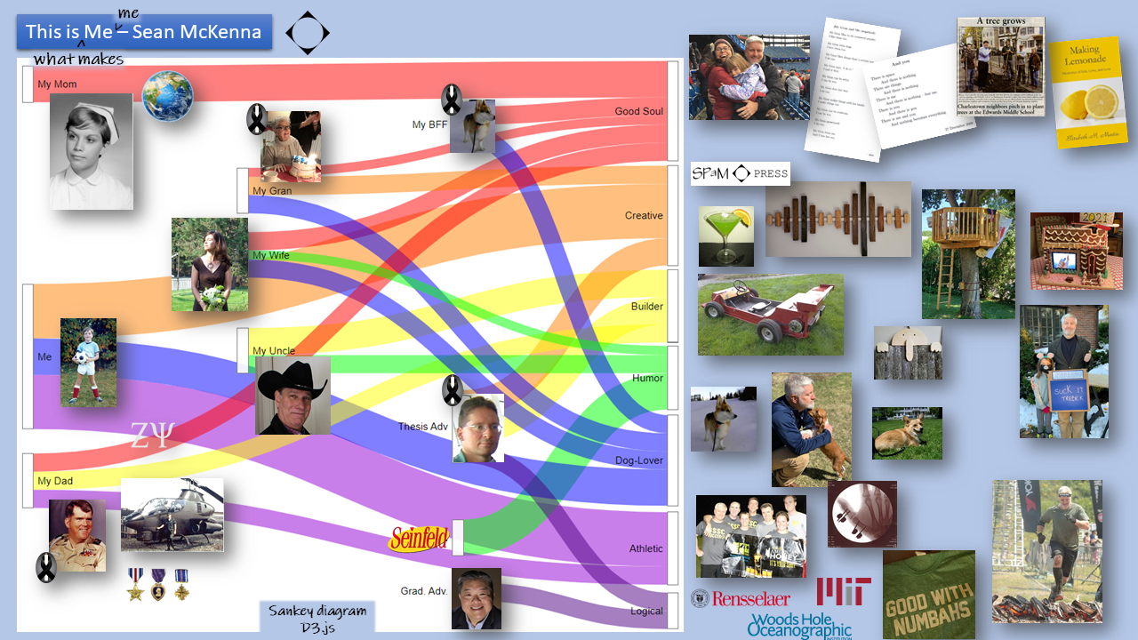 This Sankey /collage diagram was a personal creation that Dr. McKenna used during a weekly team meeting at a previous employer. The object was to create a PowerPoint slide with the theme of “This is Me.” Dr. McKenna, always looking to innovate, went one step further and produced a “This is What Makes Me Me” visualization.
